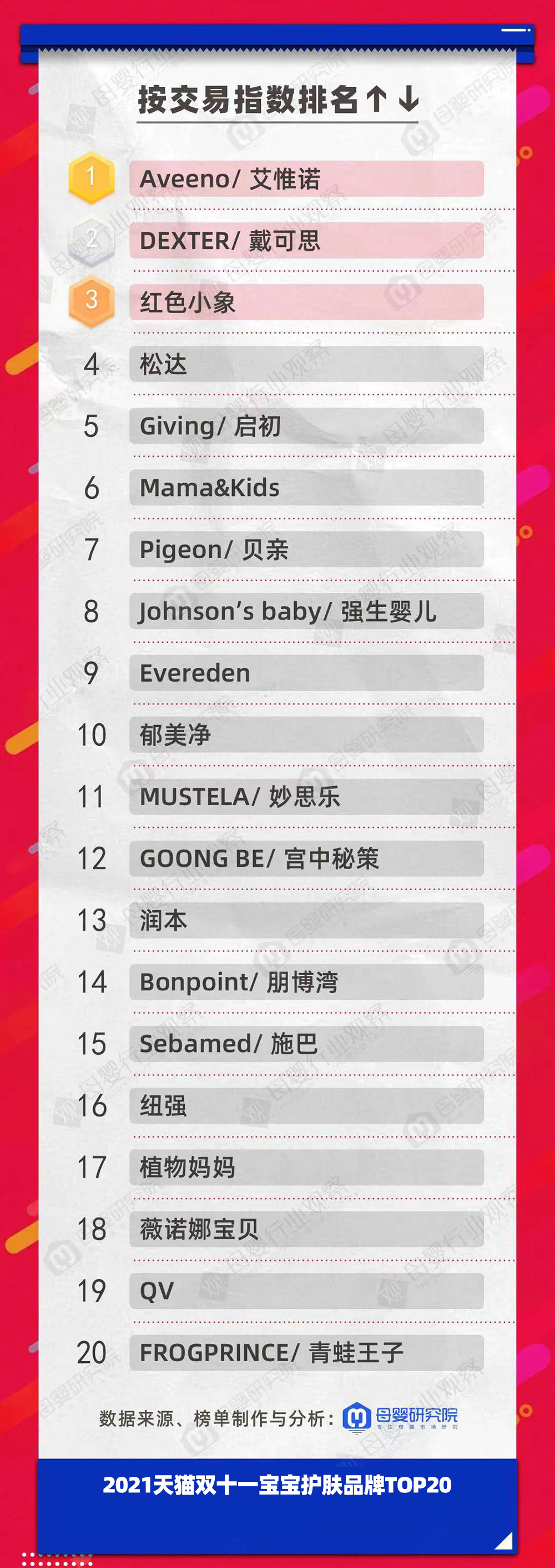 寶寶護膚品牌的Aveeno艾維諾、DEXTER戴可思以及紅色小象問鼎品類TOP3。上一年度雙11的品類前三分別為Aveeno艾維諾、紅色小象和松達。