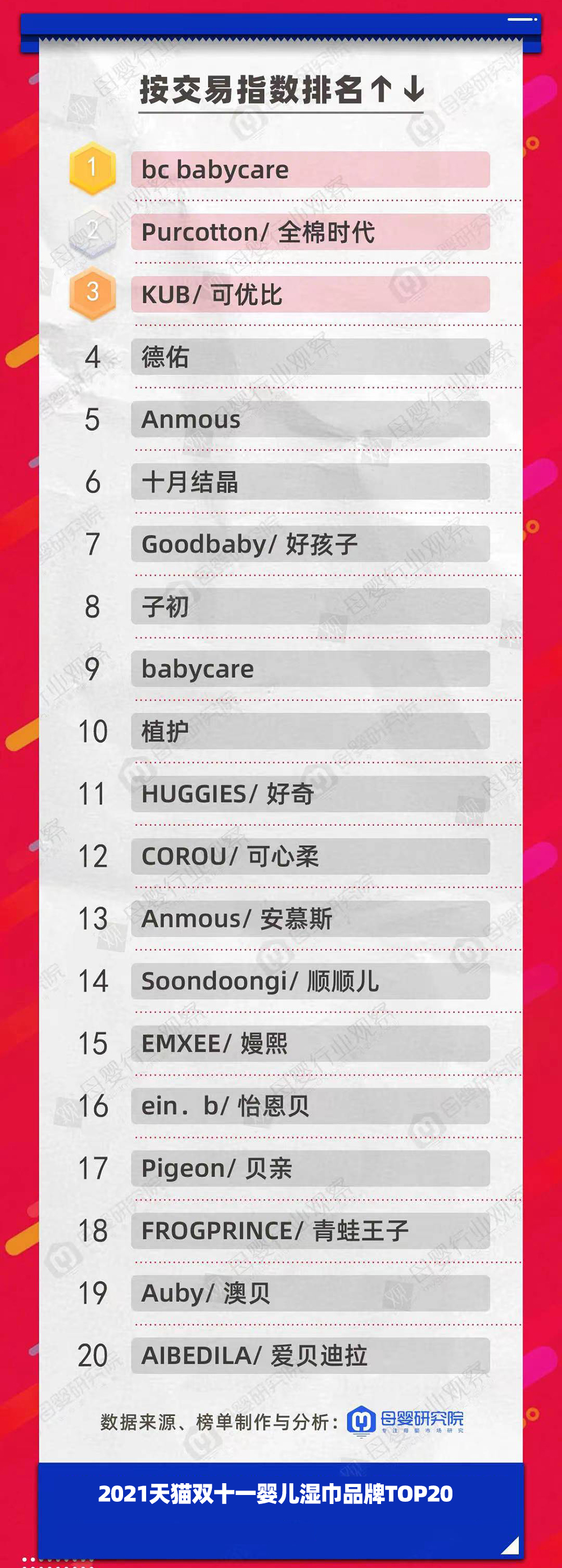 嬰兒濕巾品類當中,babycare、Purcotton全棉時代以及KUB可優(yōu)比占據(jù)了頭三把交椅。去年雙11排名前三的是BABYCARE BY PHILEMON、Purcotton全棉時代和Goodbaby好孩子。