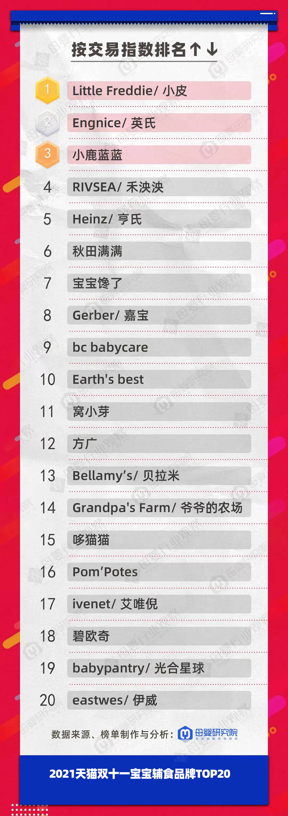 在寶寶輔食品牌交易指數(shù)前三的是Little Freddie小皮、Engnice英氏以及小鹿藍藍。而去年前三的是Gerber嘉寶、Little Freddie小皮和寶寶饞了,英氏排名第四。