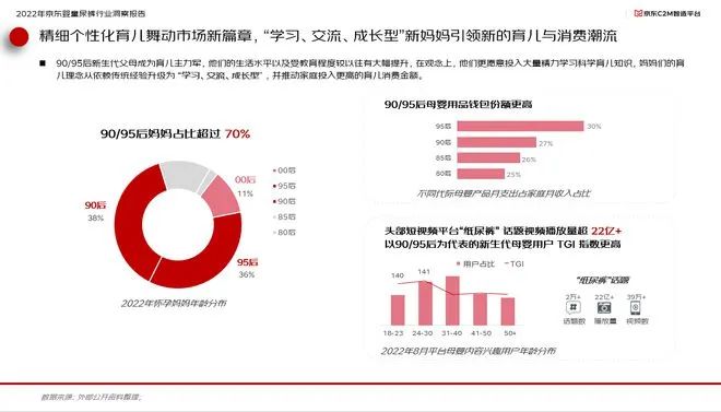 隨著90/95后新生代父母成為育兒主力軍,他們的生活水平以及受教育程度較以往有大幅提升,在觀念上,他們更愿意投入大量精力學(xué)習(xí)科學(xué)育兒知識,媽媽們的育兒理念從依賴傳統(tǒng)經(jīng)驗(yàn)升級為“學(xué)習(xí)、交流、成長型”,并推動家庭投入更高的育兒消費(fèi)金額。這些個性化的育兒方式也激活了市場新篇章,95后父母在母嬰用品的月支出占到了家庭月收入的30%。