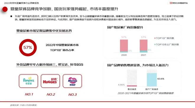 面對市場空間的變化,國內(nèi)嬰童尿褲品牌競爭加劇。其中外資廠商憑借先進(jìn)技術(shù)、良好口碑以及用戶積累等先發(fā)優(yōu)勢,至今占據(jù)嬰童尿褲市場重要份額。而一方面,隨者新生代父母在品牌選擇方面更加理性,加之疫情下的經(jīng)濟(jì)影響,嬰單尿褲也呈現(xiàn)出品牌粘性不足的特征。與此同時,得益于品質(zhì)升級和消費(fèi)者對國貨信心的提升,國貨品牌借助新零售渠道迅速崛起,為主流市場注入活力。報告顯示,本土頭部廠商份額從2020年的5%迅速提升至2021年的8%,而國產(chǎn)廠商銷售額年增速則達(dá)到63.6%,遠(yuǎn)超行業(yè)整體增速的4.9%。