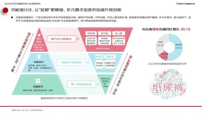 在產(chǎn)品細(xì)分賽道方面,功能和場景細(xì)分、個性化體驗(yàn)成為未來市場發(fā)展新動能。圍繞不同場景、不同功能、不同人群創(chuàng)新擴(kuò)容,能夠更好地滿足用戶精細(xì)、多元化的需求。細(xì)分品類下,適用于大齡寶寶運(yùn)動和穿脫自由的“拉拉褲”關(guān)注度顯著提升,成為高端尿褲領(lǐng)域里的趨勢單品。報告顯示,2022年8月,“拉拉褲”關(guān)鍵詞搜索份額同比提升29.1%。讓“屁糧"更精細(xì),多元需求加速供給端升級創(chuàng)新。