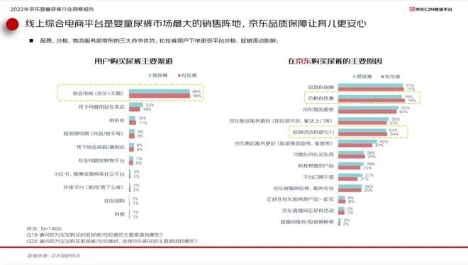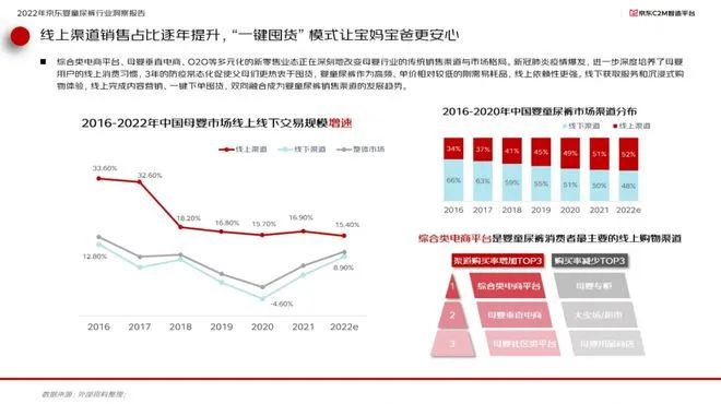 報告顯示,2022年中國嬰童尿褲市場渠道分布上,線上渠道占比已經(jīng)超過線下渠道達(dá)到52%,而以京東為代表的綜合類電商是嬰童尿褲消費(fèi)者最主要的線上購物渠道。