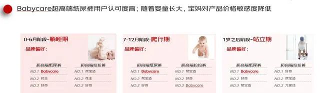 報告還對國產(chǎn)母嬰用品品牌Babycare進(jìn)行了解析,發(fā)現(xiàn)該品牌的超高端紙尿褲用戶認(rèn)可度高,無論是0-6個月,還是7-12個月,以及1歲之后階段,Babycare超高端紙尿褲都是用戶品牌偏好榜首。而且隨著嬰童長大,寶媽對產(chǎn)品價格敏感度降低,Babycare超高端紙尿褲成為了諸多寶媽的首選產(chǎn)品。
