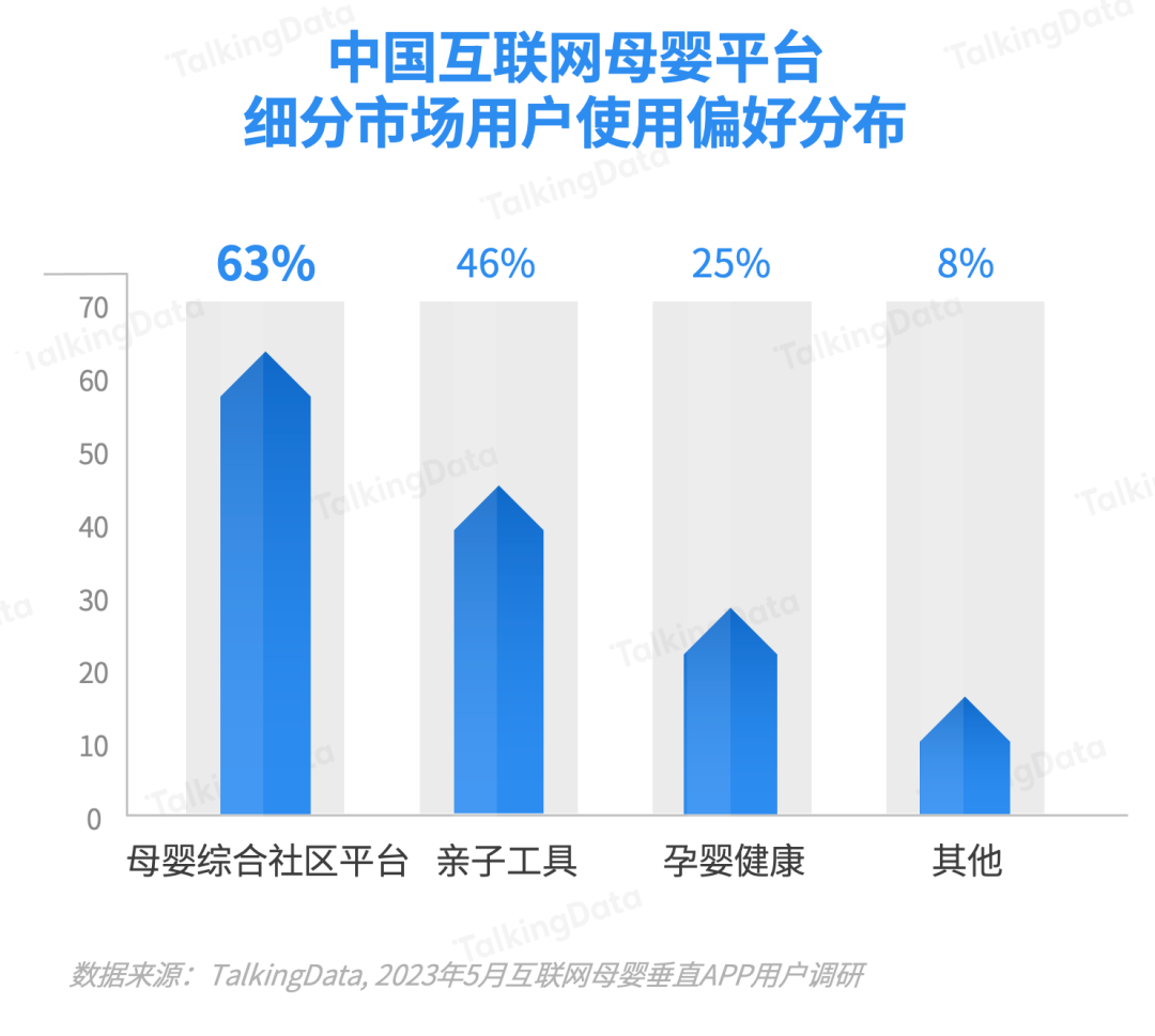 使用母嬰綜合社區(qū)的母嬰平臺用戶占比更高,達到63%,這表明用戶更偏愛涵蓋工具+社區(qū)等復合型垂直平臺。