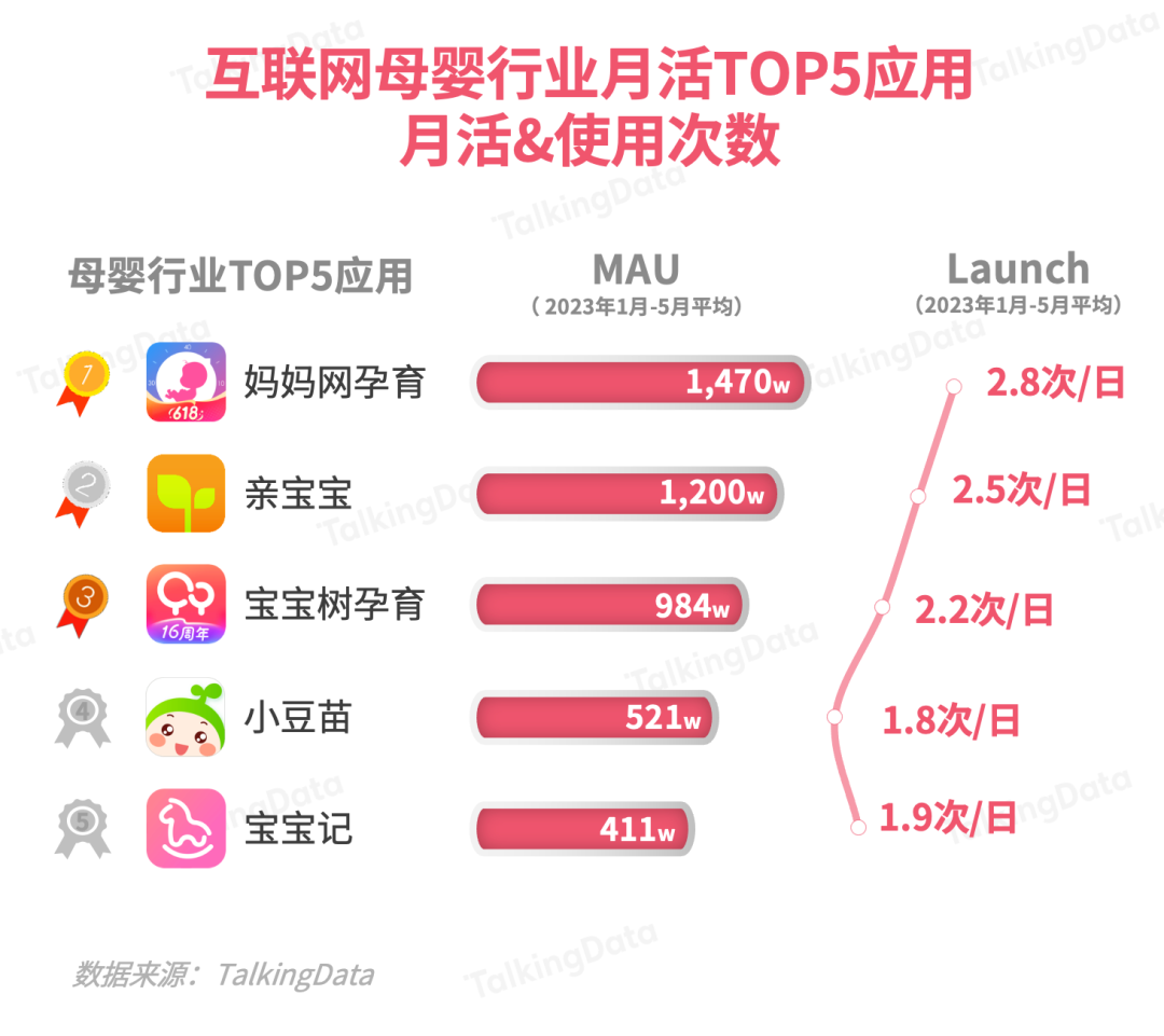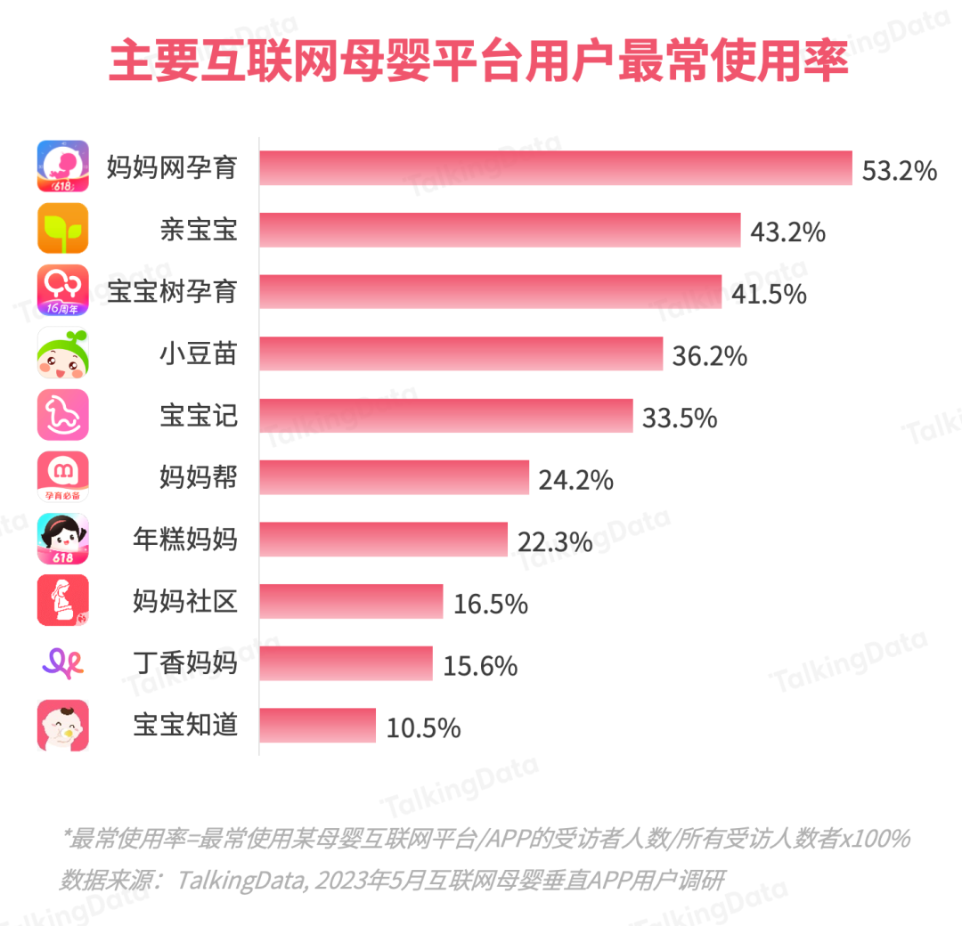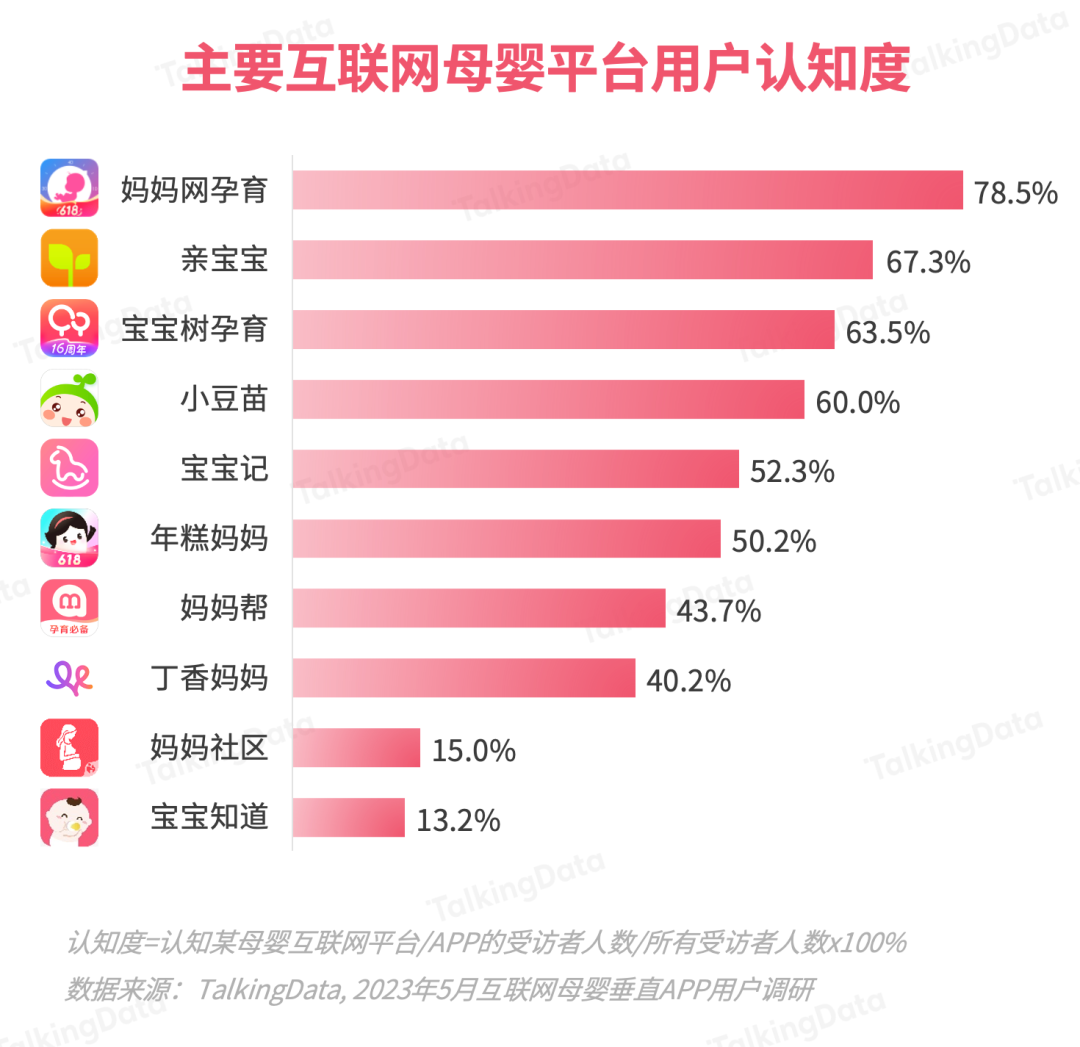 基于TalkingData的母嬰行業(yè)應用數(shù)據(jù)及2023 年5月的調(diào)研數(shù)據(jù),報告對主要互聯(lián)網(wǎng)母嬰平臺的月活、認知、使用等數(shù)據(jù)進行了統(tǒng)計分析。