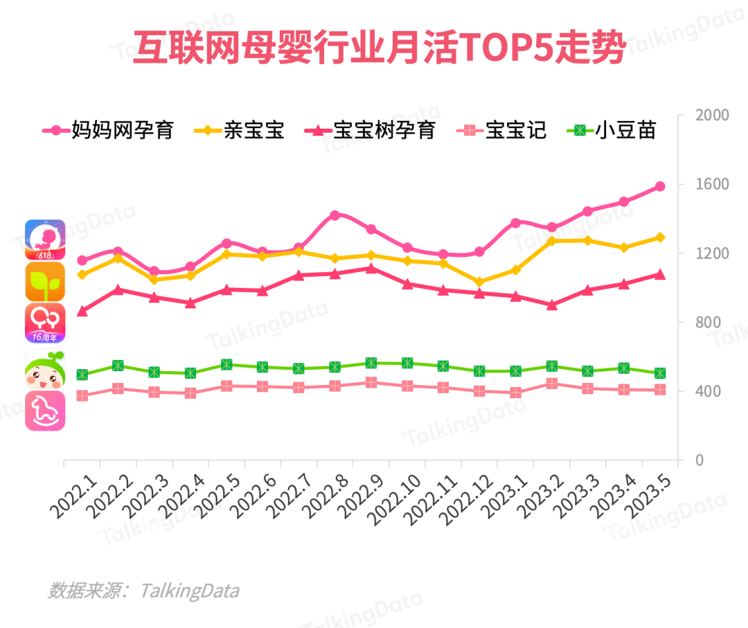 在行業(yè)Top 5平臺的2023年1-5月月活趨勢上,媽媽網(wǎng)孕育、親寶寶、寶寶樹孕育均表現(xiàn)出不同程度的增速??赡艿靡嬗谄淠笅胗脩羧后w的忠誠度和能提供有價值的版塊/內(nèi)容,媽媽網(wǎng)孕育體現(xiàn)出更為顯著的優(yōu)勢。